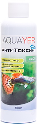 AQUAYER АнтиТоксин Vita – используется для подготовки воды безопасной для рыб в аквариуме. Особенная формула позволяет моментально устранить хлор и хлорамин, а также токсичные для аквариумных обитателей тяжелые металлы из водопроводной воды, без необходимости отстаивания воды. Наличие витамина В1 смягчает стресс рыб как при подмене воды, так и при пересадки рыб в новый аквариум. Регулярное использование препарата позволяет избежать заболеваний рыб.