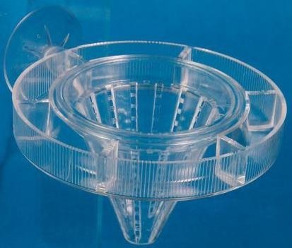 Кормушка обладает съемной сеточкой в виде конуса, которая так же позволит вам использовать кормушку для введения живого корма.