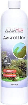 AQUAYER АльгоШок - средство против зеленых нитчатых водорослей и цветения воды. AQUAYER АльгоШок действует на те водоросли в аквариуме, против которых AQUAYER Альгицид+СО2 слабо эффективен. Эти два альгицида имеют разный механизм действия на водоросли. Если Альгицид+СО2 более эффективен против красных водорослей (черная борода, олений рог) и ксенококуса, то действие АльгоШока больше сфокусировано на зеленых нитчатых водорослей и цветение воды (зеленая вода).