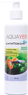 AQUAYER АнтиТоксин Vita – используется для подготовки воды безопасной для рыб в аквариуме. Особенная формула позволяет моментально устранить хлор и хлорамин, а также токсичные для аквариумных обитателей тяжелые металлы из водопроводной воды, без необходимости отстаивания воды. Наличие витамина В1 смягчает стресс рыб как при подмене воды, так и при пересадки рыб в новый аквариум. Регулярное использование препарата позволяет избежать заболеваний рыб.