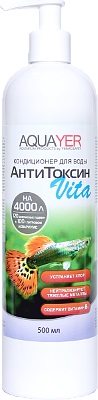 AQUAYER АнтиТоксин Vita – используется для подготовки воды безопасной для рыб в аквариуме. Особенная формула позволяет моментально устранить хлор и хлорамин, а также токсичные для аквариумных обитателей тяжелые металлы из водопроводной воды, без необходимости отстаивания воды. Наличие витамина В1 смягчает стресс рыб как при подмене воды, так и при пересадки рыб в новый аквариум. Регулярное использование препарата позволяет избежать заболеваний рыб.