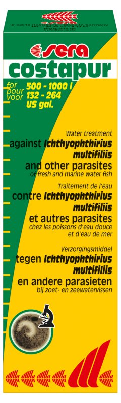 Возможно использование Sera костапур в качестве профилактического средства при карантине вновь приобретенных рыбок. В этом случае следует добавить четыре капли препарата на 25 литров воды (карантинной емкости )и поместить новых рыбок в эту емкость на несколько дней.