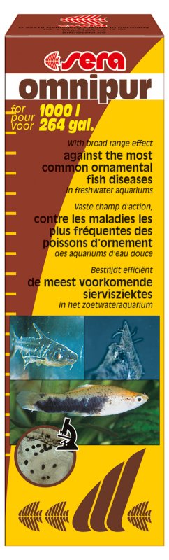 Универсальный кондиционер для аквариумной воды, который эффективно, быстро и безопасно борется почти со всеми болезнетворными микроорганизмами, встречающимися в пресной воде. К ним относятся возбудители бактериальных инфекций (например, Columnaris, Aeromonas,Pseudomonas, плавниковая и жаберная гниль), инфекций, вызванных грибками (например,Saprolegnia), одноклеточные кожные паразиты (например, Ichthyobodo, Chilodonella, Trichodina), а также жаберные и кожные черви. Также применим для дезинфекции внешних повреждений и ран, а также для предотвращения вторичных инфекций. Для предотвращения проникновения в общий аквариум инфекций и паразитов полезно использовать Sera Omnipur для "карантина" рыб.