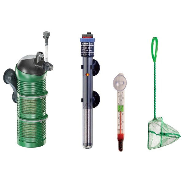 В комплектацию аквариума входит оборудование:  фирмeнный кассетный внутренний фильтр, автоматический нагреватель, сачок 5" и спиртовой термометр на присоске.  Лампа LED 7,7W.