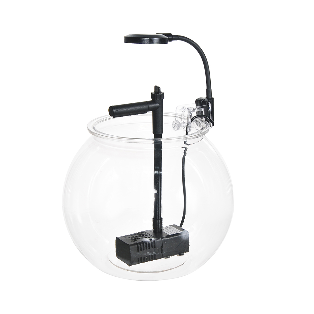 Шарообразный аквариум с устройствами для создания небольшого биотопа с петушком.