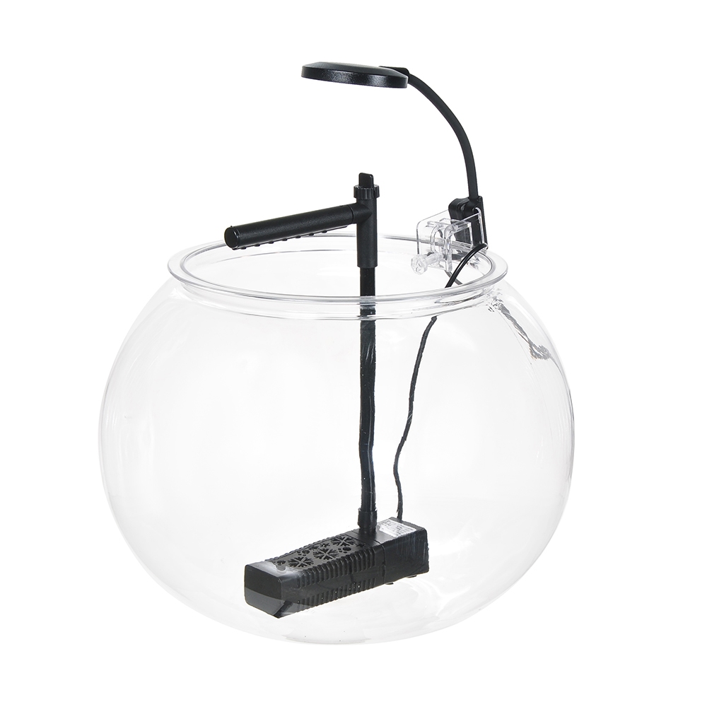Аквариумный набор Naribo. В набор входит: аквариум-шар (пластиковый), фильтр, светильник, два USB адаптера. Аквариум объемом 12 литров, изготовлен из высококачественного пластика. В комплект входит фильтр мощностью 2,5Вт и производительностью 150 л/ч. Также входит светодиодный светильник мощностью 5Вт.