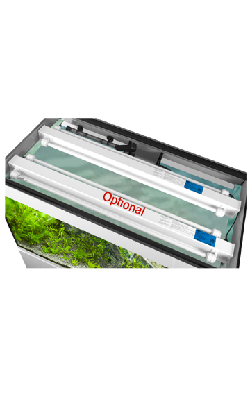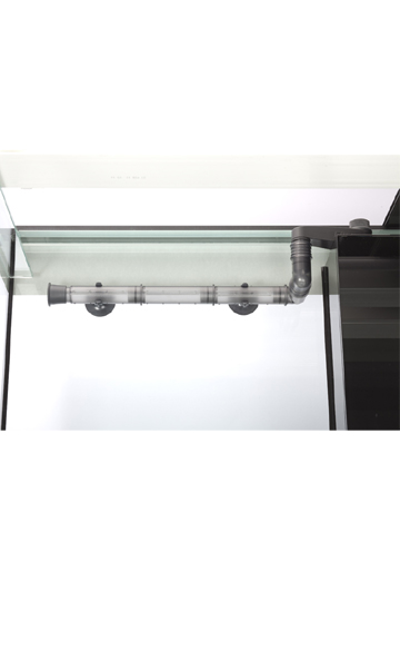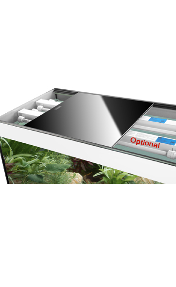 Сдвигaемые панели крышки позволяют одним плaвным движением получить доступ к значительной части поверхности воды. Вертикaльная "шахта" в центральной части задней стенки представляет собой полый "колодец" для проводки выпускных шлангов фильтра и электрокабелей. Водозабор осуществляется через специальный патрубок, встроенный в дно аквариума. Выпуск снабжён профессионaльной "дождевальной флейтой".