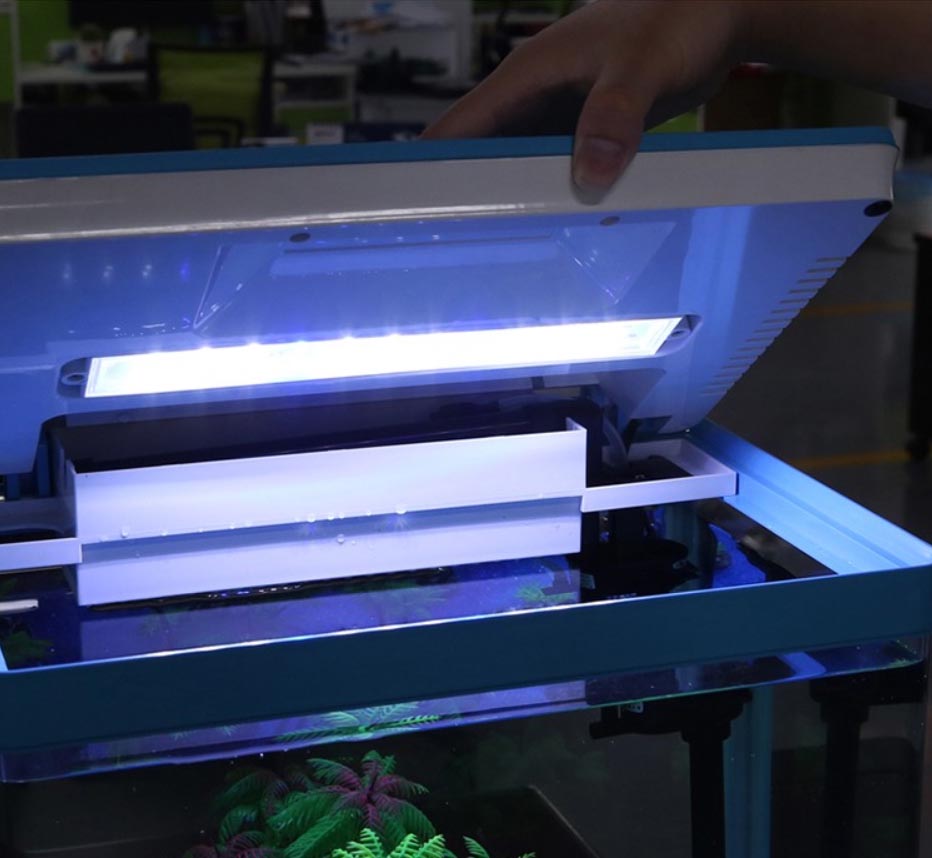 Светильник оснащен 3-мя видами светодиодов (белые, синие и красные) и потребляет всего 3,5 Ватт электроэнергии. Включение светильника осуществляется с помощью кнопки сверху аквариума.