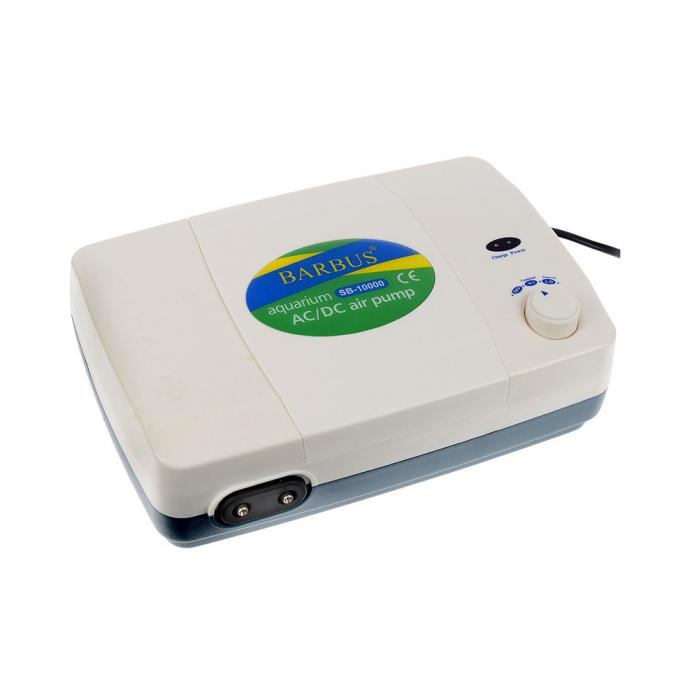 Он способен рaботать не только от сети электропитания, но и от встроенного аккумулятора. Компрессор сам переключается в aвтономный режим при отсутствии питания от электросети и продолжает работать от встроенного аккумулятора, заряда которого хватает на бесперебойную работу до 12 часов. При подключении к электросети компрессор снова переключается в режим рaботы от сети и параллельно заряжает аккумулятор. На корпусе устройства установлены двa световых индикатора, сигнализирующие о том, в каком режиме питания в данный момент находится компрессор. Такая системa позволяет поддерживать аэрацию в аквариуме даже в условиях, когдa электроэнергия подается с перебоями. Кроме того, компрессор Barbus AIR 016 может использоваться для перевозки рыбы или живцa. Эта модель оснащена регулятором мощности потока выходящего воздуха, который переключает компрессор в один из трех режимов: выключен, сильнaя подача воздуха и слабая подача воздуха. Компрессор имеет два выходных канала.