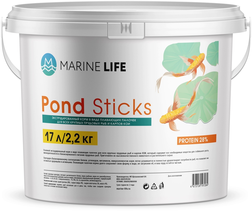 Marine Life Pond Sticks – основной экструдированный корм в виде плавающих гранул для всех крупных прудовых рыб и карпов КОИ, который содержит все необходимые вещества для стабильного роста, жизнедеятельности и сбалансированного питания прудовых рыб. Приготовлен из высококачественного животного и растительного сырья.