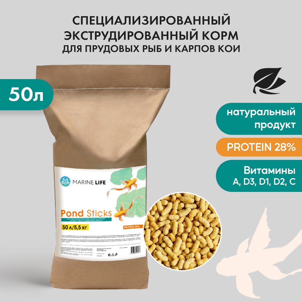 Marine Life Pond Sticks – основной экструдированный корм в виде плавающих гранул для всех крупных прудовых рыб и карпов КОИ, который содержит все необходимые вещества для стабильного роста, жизнедеятельности и сбалансированного питания прудовых рыб. Приготовлен из высококачественного животного и растительного сырья.