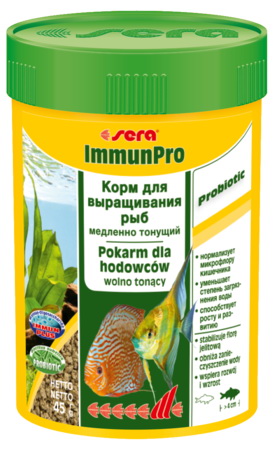 Sera ИммунПро – медленно тонущий корм для выращивания рыб для всех декоративных рыб размером более 4 см. Пробиотики, добавленные в корм посредством особенно бережного процесса, нормализуют микрофлору кишечника декоративных рыб. Повышенная усваиваемость корма существенно уменьшает степень загрязнения воды. Благодаря высокому содержанию белка (более 50%), а также входящим в состав пробиотикам и другим функциональным ингредиентам, таким как МОС, водоросли гематококкус и спирулина корм для выращивания способствует быстрому росту, здоровому развитию, а также яркой насыщенной окраске рыб.