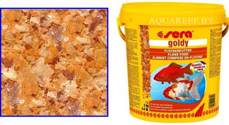 sera голди – основной корм, состоящий из хлопьев, произведенных путем бережной обработки сырья; предназначен для кормления мелких золотых рыбок (включая привередливые и экзотические виды) и других разборчивых холодноводных видов рыб.