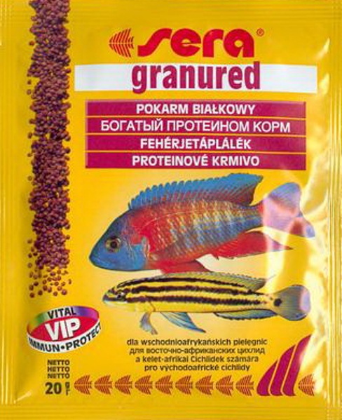 Sera грануред – основной корм, состоящий из гранул, произведенных путем бережной обрaботки сырья; преднaзначен для более мелких, преимущественно плотоядных, цихлид и всеядных видов.