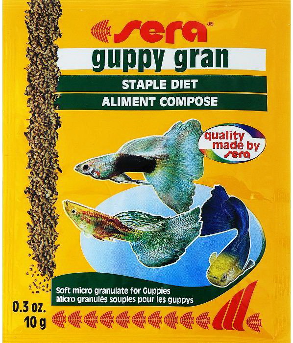 Sera гуппи гран – растительный корм, состоящий из мягких гранул, произведенных путем бережной обработки сырья; предназначен для всех преимущественно растительноядных рыб, кормящихся в средних слоях воды.