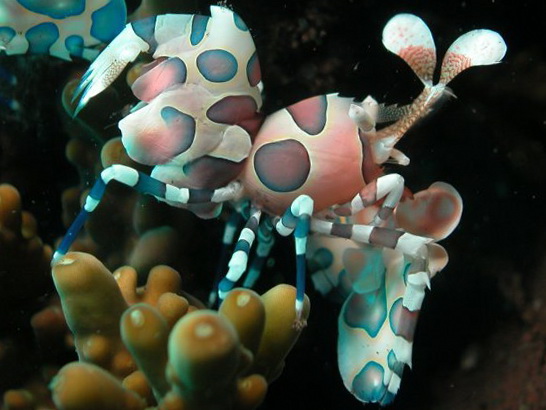 Причудливая внешность этих креветок сразу привлекает внимание. Рисунок из красноватых пятен неправильной формы на светлом фоне смотрится очень элегантно. Клешни сильно увеличены и составляют более половины длины тела. Самки несколько крупнее самцов. Они отличаются также синей окраской последних члеников брюшных ног, которые у самцов прозрачные. Необходимо достаточное количество укрытий. Для нормальной линьки в воду необходимо добавлять йод.