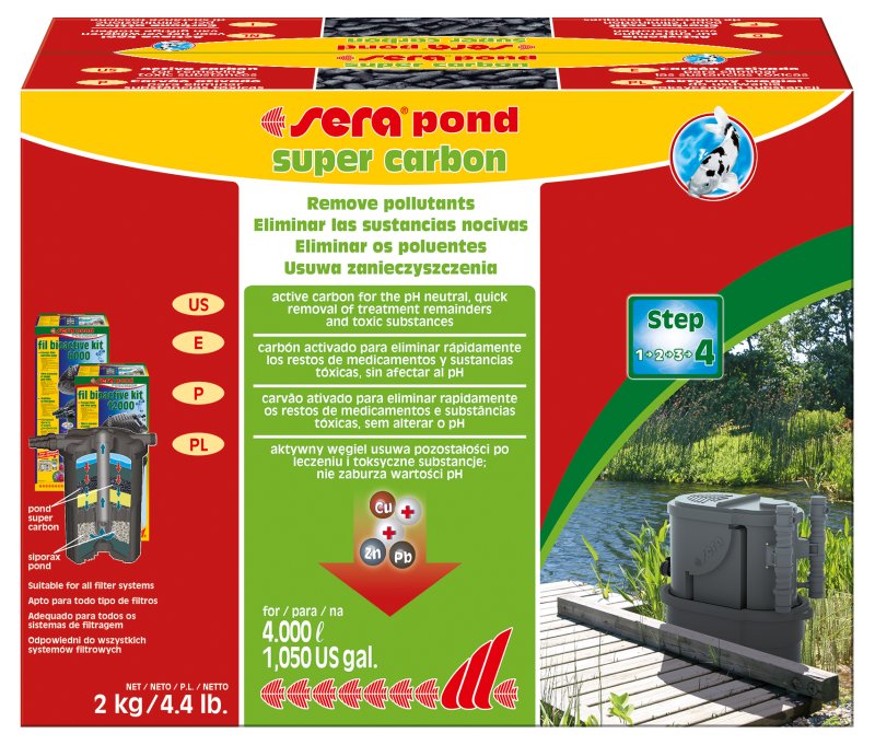 После окончания проведения лечения остатки лекарственных средств, которые больше не понадобятся, должны быть удалены из воды как можно быстрее и как можно более тщательно. Это поможет избежать излишнего загрязнения воды вредными веществами и, таким образом, не будет создана новая причина для стресса. Специальный активированный уголь с высокой абсорбирующей активностью sera pond супер карбон быстро, эффективно, без побочных эффектов и не влияя на величину pH удаляет из воды не только остатки лекарственных средств, но и другие опасные токсичные вещества, которые, например, могут незаметно попасть в пруд с дождевой водой (вредные вещества, находящиеся в окружающей среде; составные части удобрений; гербициды; пестициды и т.д.).