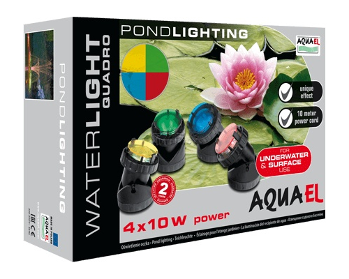 Waterlight Quadro - это набор подводных ламп мощностью 10 Вт каждая. Благодаря сменным световым фильтрам возможно создание разноцветной иллюминации в саду или в водоёме. Действуют по безопасной технологии 12 V. Их установку облегчает 10-метровый кабель питания. Направление света можно установить под разными углами.