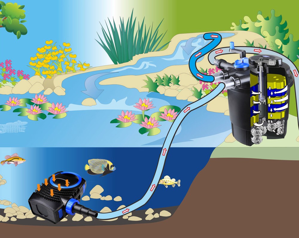 Прудовые фильтры SunSun сочетают механическую и биологическую очистку. При первом запуске пруда лучше воспользоваться так называемыми «биостартерами» (бактериями выращенными в лабораторных условиях). Их использование может значительно ускорить становление баланса в пруду.