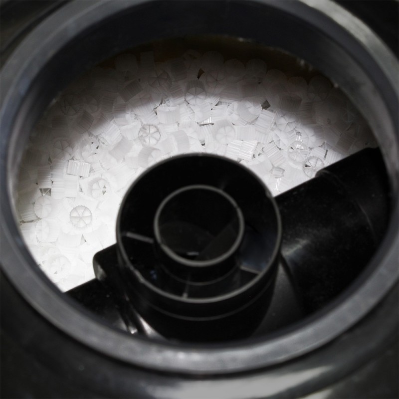 Биозагрузка выполнена из химически неактивного пластика и при своих небольших размерах (17х10 мм) имеет высокую площадь заселения, примерно 1000 м2 в 1 кубе.