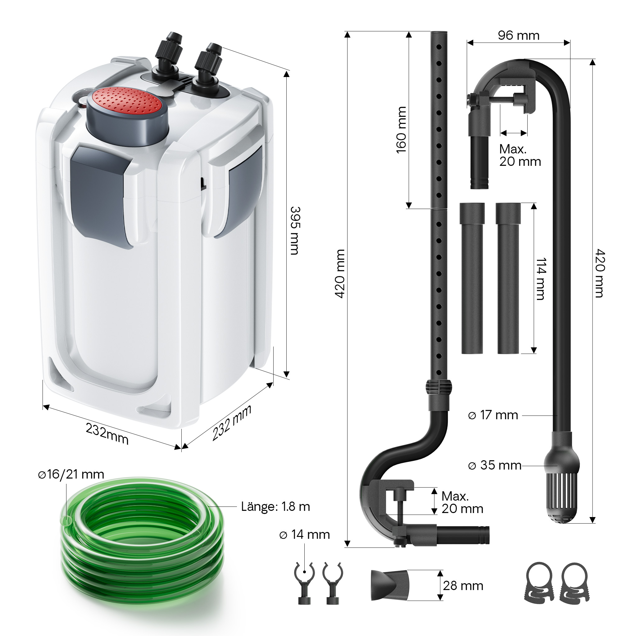 В комплекте к внешнему фильтру идут все необходимые аксессуары, шланги, трубки, флейта, переходники и синтепоновый наполнитель.
