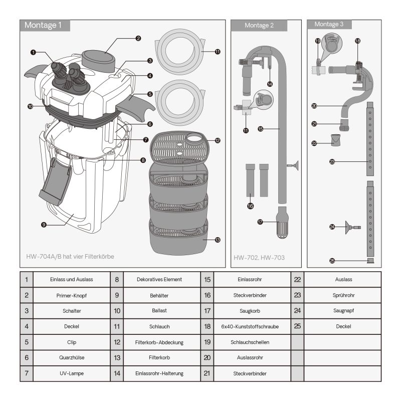 Поток воды при прохождении через фильтр сначала попадает в отсек с УФ лампой. Одноклеточные водоросли, вызывающие «цветение» воды и другие нежелательные микроорганизмы, в т.ч. патогенные, разрушаются уже при входе в фильтр. Очищенная от микроорганизмов вода попадает в следующие отсеки, где проходит уже механическую, биологическую и химическую (при наличии соответствующих наполнителей) очистку.