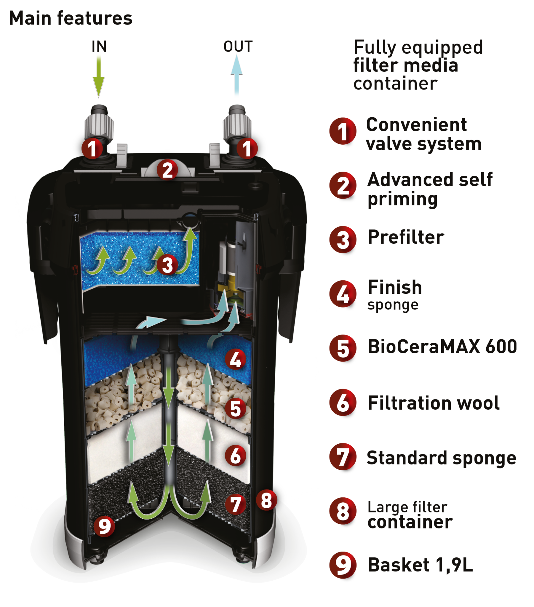 Беспрецедентная производительность: устройство отличается очень большой пропускной способностью (максимальные значения от 1000 до 2000 л/ч), благодаря чему они могут эффективно работать даже в очень больших аквариумах (объёмом до 700 л). Более того, они очень вместительны и содержат значительное количество фильтрующих наполнителей, помещённых в удобные, эргономичные корзинки объемом 1,9 л каждая (в зависимости от модели, количество корзинок составляет от 3 до 5). Благодаря этому они обеспечивают эффективную механическую и биологическую фильтрацию воды. В комплект входят наполнители, тщательно подобранные для нужд типичного аквариума.